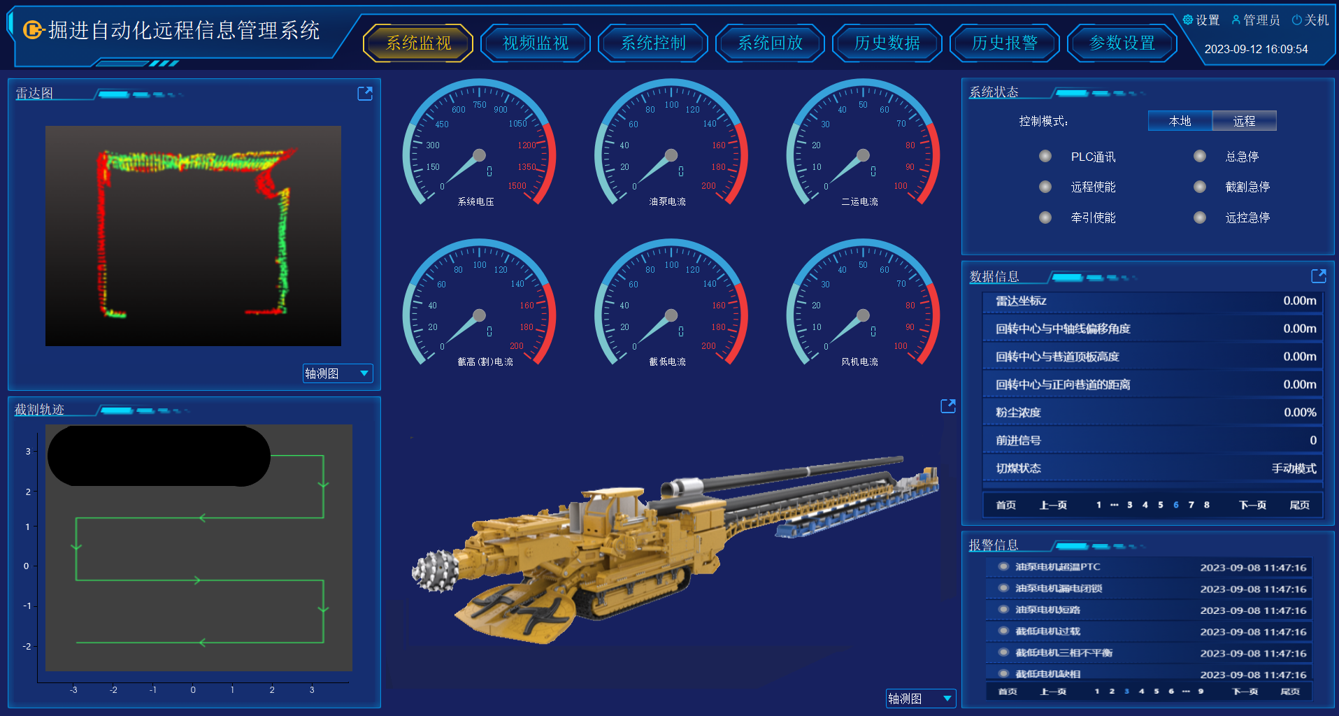 Интеллектуальная система полностью механизированного забоя включает в себя интеллектуальную систему мониторинга проходческого комбайна, интеллектуальную систему сцепления оборудования забоя, подземный централизованный центр управления, наземный центр мониторинга и облачную систему управления эксплуатацией и техническим обслуживанием. Оснащен визуальной инерциальной навигационной системой, системой радиолокационного обнаружения, системой мониторинга датчиков, системой передачи данных и т. Д. И сотрудничает с системой передачи данных каждого оборудования на рабочей поверхности для реализации интеллектуального мониторинга, взаимодействия с данными, управления рычажным механизмом, а также запуска и остановки одним нажатием кнопки комплексного экскаватора, самодвижущегося хвоста, ленточного конвейера, системы водяного насоса, системы электропитания, системы вентиляции и удаления пыли в удаленном централизованном центре управления. Скважинные данные могут передаваться на поверхность через скважинную кольцевую сеть или сеть 5G для удаленного мониторинга, а также могут быть подключены к Интернету для реализации загрузки данных в облако и реализации функции мониторинга данных оборудования в офисе или мобильного телефона и других мобильных терминалов.