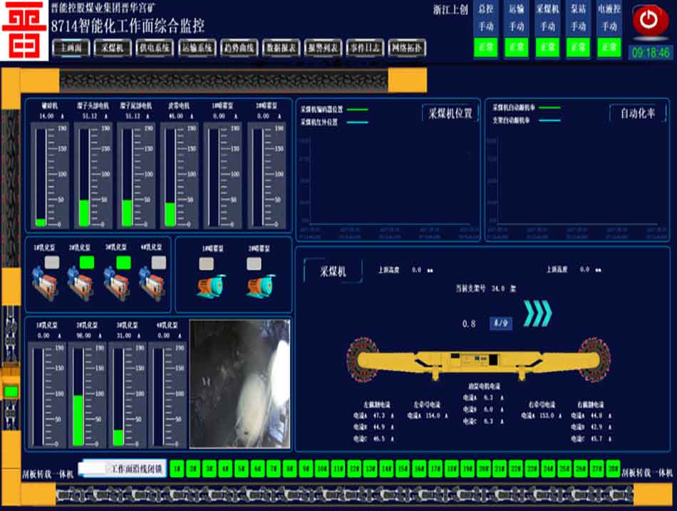 綜采工作面智能化控制系統(tǒng)將工作面采煤機、液壓支架、運輸機、泵站及供電系統(tǒng)等有機結(jié)合起來,實現(xiàn)地面調(diào)度中心監(jiān)測、順槽監(jiān)控中心對綜采工作面設(shè)備的遠程監(jiān)控以及數(shù)據(jù)的實時顯示和智能開采。 解決割煤不傷人,將工人從危險的工作面轉(zhuǎn)移到安全的順槽監(jiān)控中心,實現(xiàn)工作面的自動化生產(chǎn),減少工作面區(qū)域工作人員,實現(xiàn)安全、高產(chǎn)高效采煤。